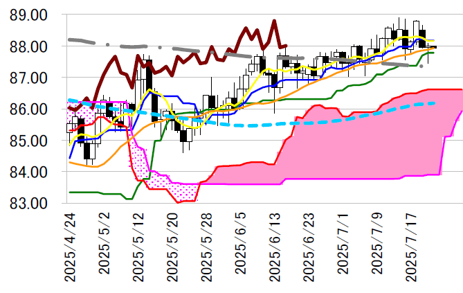 サポート1 87.38(6/13-7/15 上昇幅の半値押し)