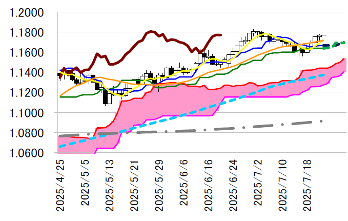 ただ、売り一巡後は買い戻しが優勢に。6月米中古住宅販売件数が予想よりも弱い内容となったことで ユーロ買い・ドル売りが入ったほか、「米国と欧州連合(EU)は関税率を15%とする方向で合意間近」と の報道をきっかけに全般ユーロ買いが活発化。前日の高値1.1760ドルを上抜けて一時1.1775ドルまで上 値を伸ばした。
