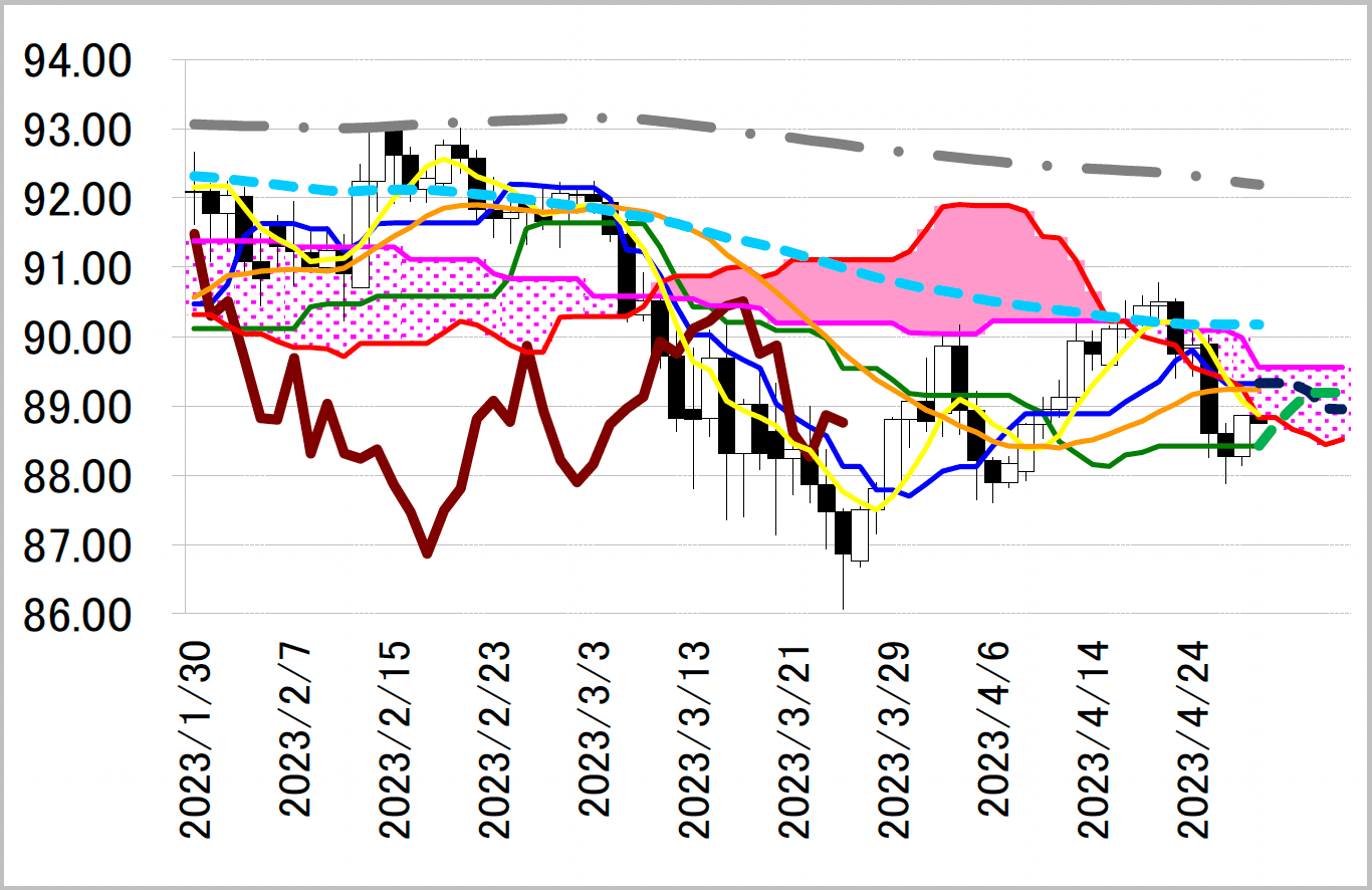 下影陽線引け。一目均衡表・基準線89.33 円を割り込んだ水準から戻す動きとなり、一時88.86 円まで上昇した。上昇傾向の基準線付近の底堅さは維持するとみるが、ここからは88.83 円へ低下した一目・雲の下限前後での重い動きが想定される。雲の中で上値を試す動きとなっても、緩やかな低下が見込まれる一目・転換線が上伸を阻むだろう。