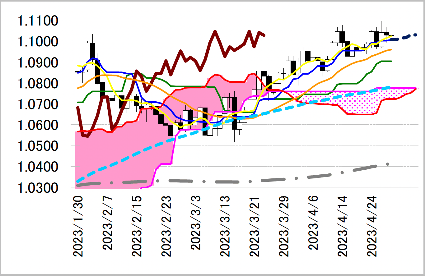 小陽線引け。133 円台で低下中の一目均衡表・雲上限の動きに追随するように133.24 円まで下値を探る動きが先行した。その後は反発して一時134.20 円と、一目・転換線134.08円を回復する場面もあった。しかし伸び悩み、134 円台に定着できずにNY を引けている。底堅いながら、雲上限の低下や頭打ちが見込まれる転換線も示唆するような上値の重い動き。次第に調整色を強め、現在132.39 円に位置している一目・基準線をやがて試す展開になるかもしれない。レジスタンス1 134.73(4/24 高値)