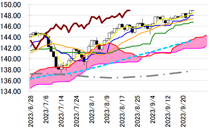 本日は、147.99 円まで上昇した転換線を支持に押し目買いスタンスで臨み、同線を下抜けた場合は手仕舞い。