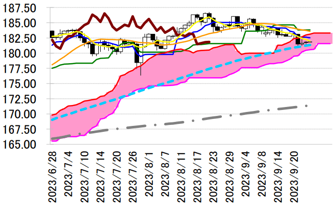 本日は、182 円半ばまで水準を下げた転換線を抵抗に戻り売りスタンスで臨み、同線を上抜けた場合は手仕舞い。