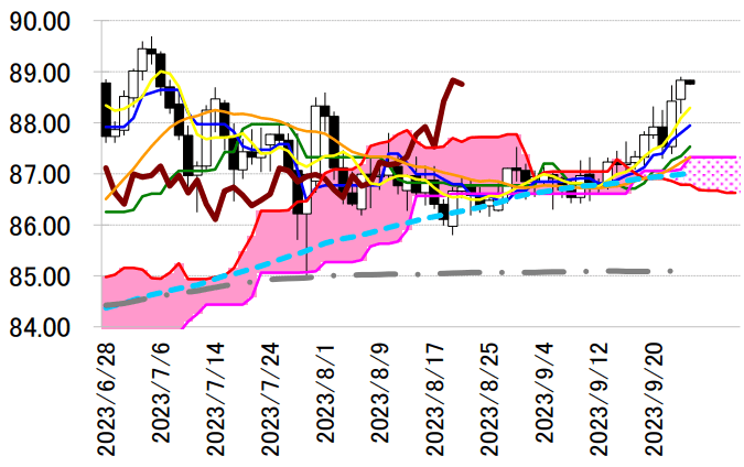 陽線引け。転換線は基準線を上回り、遅行スパンは実線を上回り、雲の上で引けていることで、三役好転の強い買いシグナルが点灯している。2 手連続陽線で転換線を上回って引けており続伸の可能性が示唆されている。本日は、87 円後半で上昇中の転換線を支持に押し目買いスタンスで臨み、同線を下抜けた場合は手仕舞い。