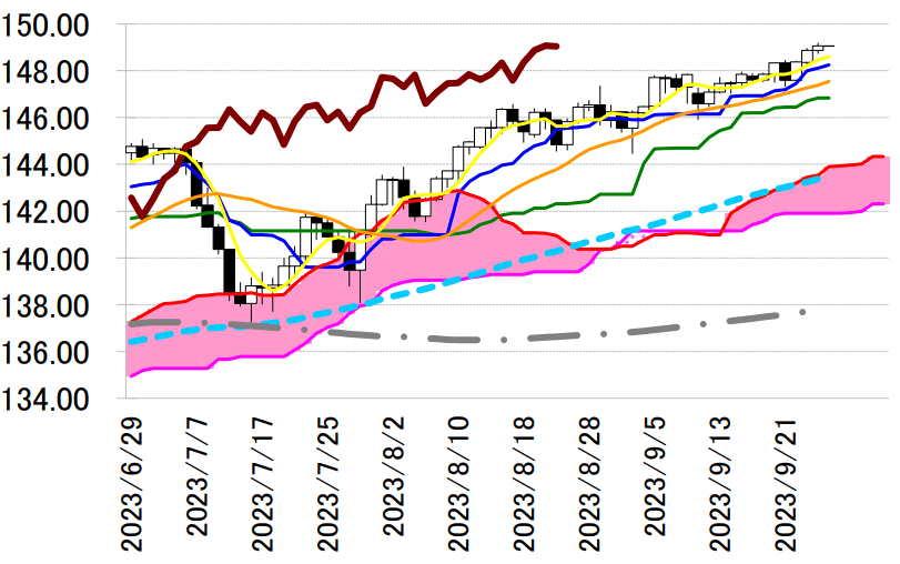本邦通貨当局の昨年秋の 3 回のドル売り・円買い介入は、ボラティリティーの抑制を名目に実施され、 水準はボリンジャー・バンドの+2σ付近だった。最近のドル円の高値と+2σは以下の通り。+2σの手前で ドル円は伸び悩んでおり、介入水準として警戒されているのが分かる。本日の+2σは 149.39 円付近に位 置している。 ・9 月 26 日:高値 149.19 円・・・+2σ 149.22 円 ・9 月 25 日:高値 148.96 円・・・+2σ 149.02 円 ・9 月 22 日:高値 148.42 円・・・+2σ 148.77 円 ・9 月 21 日:高値 148.46 円・・・+2σ 148.59 円