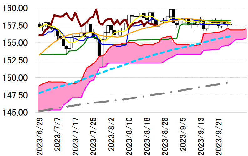 本日は、157.59 円まで水準を上げた転換線を念頭に置いた