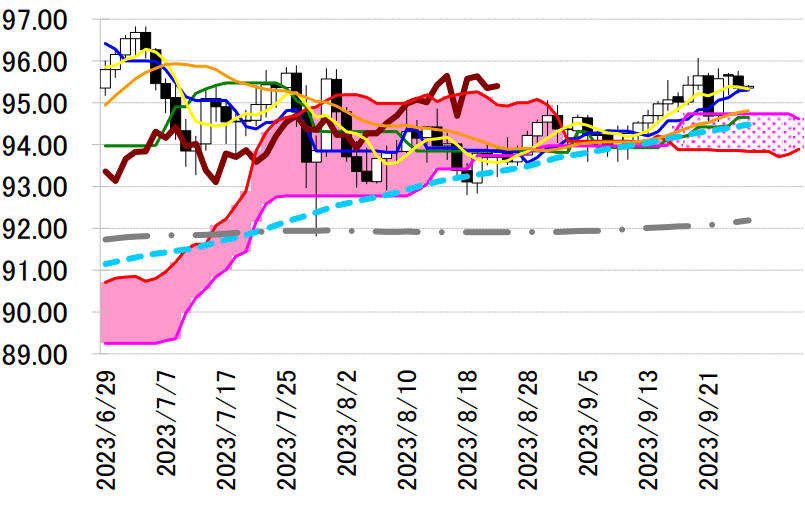 限から 21・22 日安値 94.54 円までが支持帯となりそうだ。