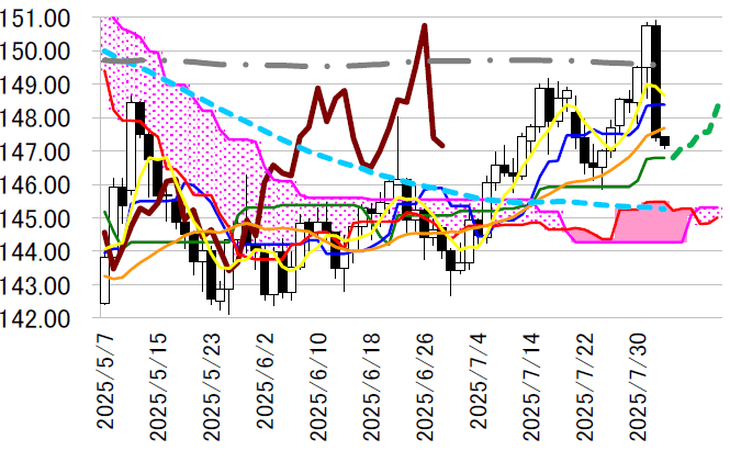 一目均衡表・転換線148.39 円や、本日147.70 円前後へ上