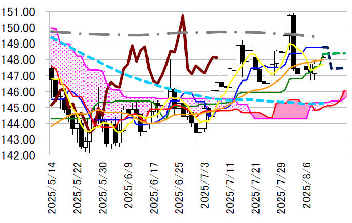 本日の東京外国為替市場のドル円は、今夜発表される米7月消費者物価指数(CPI)への警戒感から、 米7月雇用統計ショックによる下落幅(150.92円~146.62円)の半値戻し(=一目・転換線)148.77円 を意識した底堅い展開が予想される。
