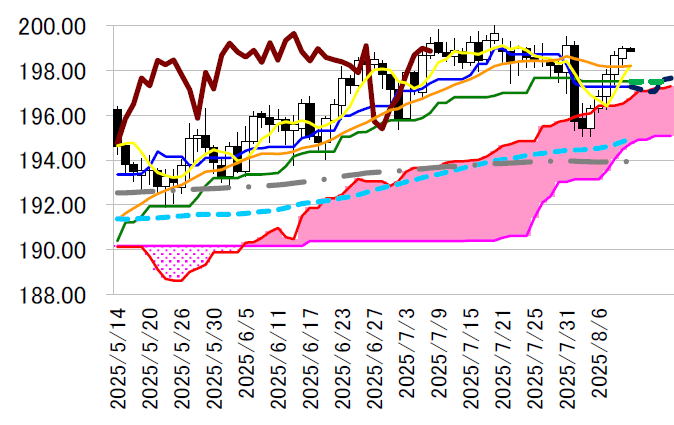 一目均衡表・転換線197.28 円が同・基準線197.51 円をやが