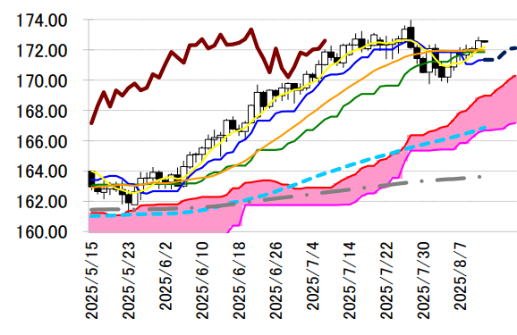 28 日以来の水準 172.86 円まで上値を伸ばしている。基準線