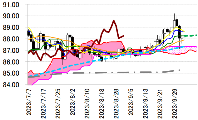 均衡表・雲の上限 87.32 円や同水準前後で上昇中の 90 日移