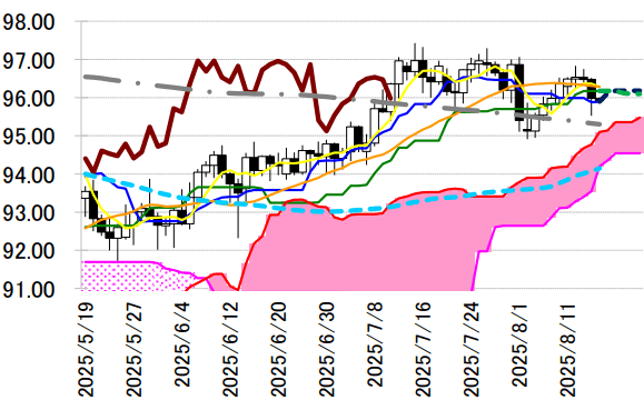 へ戻している。一目均衡表・基準線 96.17 円が目先の重しと
