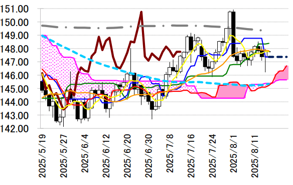 しかし、一目均衡表・転換線 147.37 円を回復する底堅さを