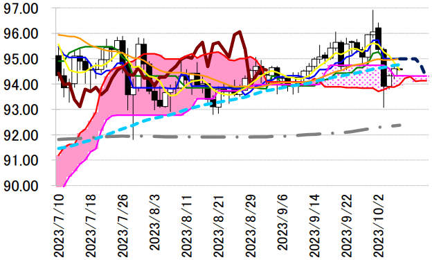 中へ戻すことができ、昨日は 94.33 円へ低下した雲の上限を