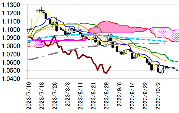 低下中の 21 日移動平均線や一目・基準線 1.0665 ドルが上昇