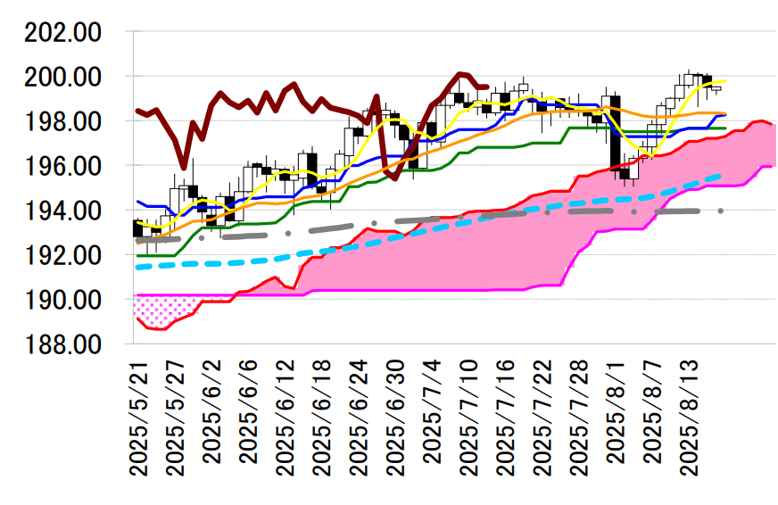 円から上向き日足一目・転換線 198.19 円を支持帯と見込む。