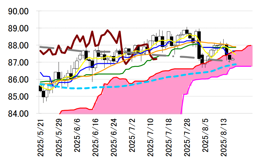 か。上値は 87 円後半の転換線から基準線が抵抗帯と想定。