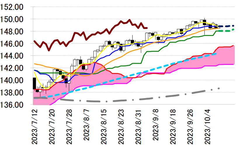 陰線引け。一目均衡表・転換線 148.80 円を割り込んで NY