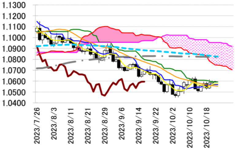 20 日のニューヨーク外国為替市場でユーロドルは小幅ながら続伸。終値は 1.0594 ドルと前営業日 NY 終値(1.0582 ドル)と比べて 0.0012 ドル程度のユーロ高水準だった。米 10 年債利回りが一時 4.9927% 前後と 2007 年 7 月以来の高水準を記録するとユーロ売り・ドル買いが先行。21 時 30 分前に 1.0565 ドル とアジア時間に付けた日通し安値に面合わせした。