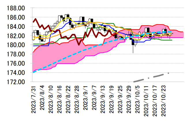 陽線引け。転換線は基準線を上回り、遅行スパンは実線を上回り、雲の中で引けていることで、買いシグナルが点灯している。しかし、抱き線で切り返したものの転換線 182.43円を下回って引けており反落の可能性が示唆されている。