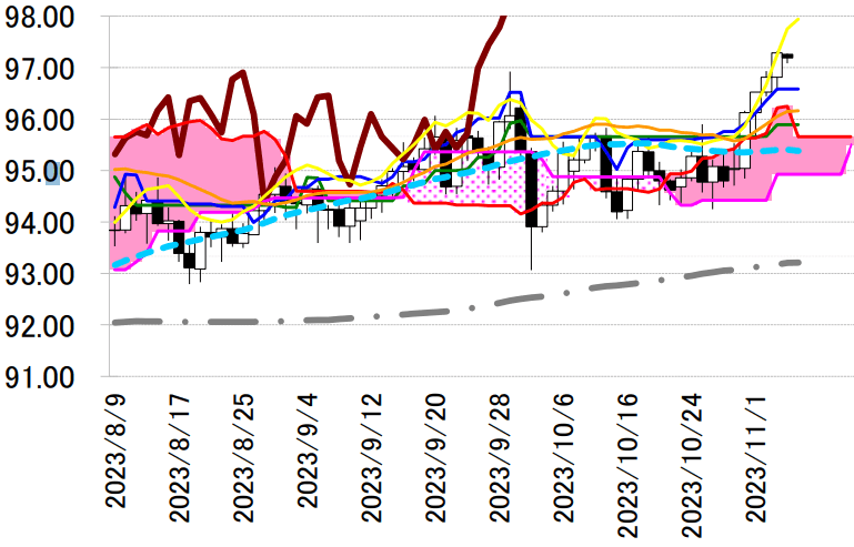 現状でのドル売り・円買い材料としては、以下の通りとなる。 ・米国議会での 11 月 17 日のつなぎ予算の期限に向けた 2024 年度予算案採決への警戒感 ・米連邦準備理事会(FRB)の利上げサイクル終了観測 ・日本銀行の金融政策正常化