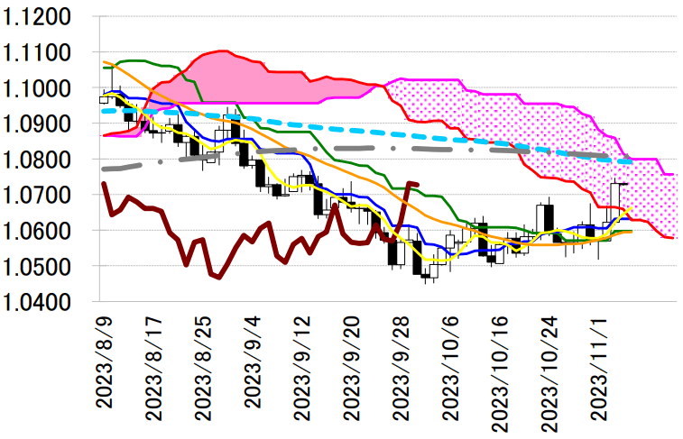 雲の下限が 1.0659 ドル、転換線が 1.0630 ドル台で横ばい。