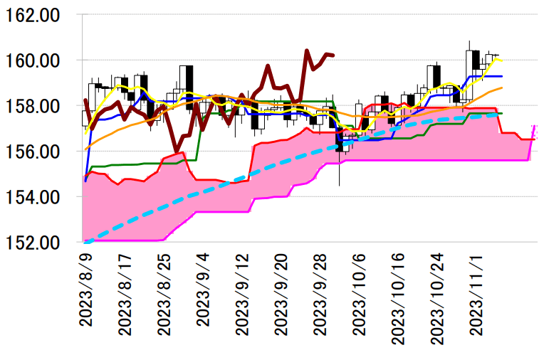 本日は 159.20 円台の転換線辺りまでを支持に押し目買い