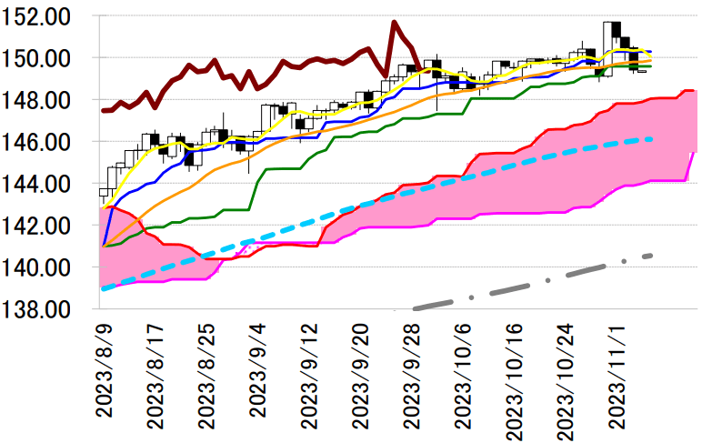 抜けた場合は手仕舞い。149.58 円で横ばいの基準線も念頭に