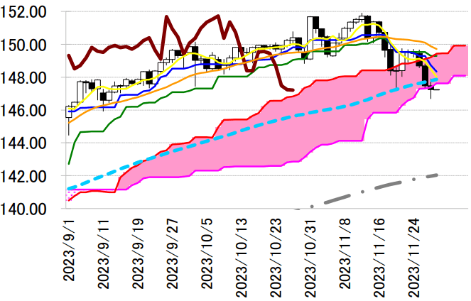 本日は 148.30 円台まで低下した転換線を抵抗に戻り売り
