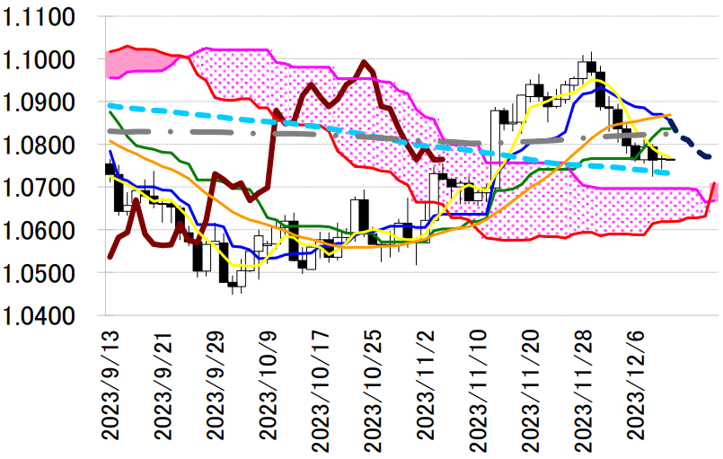 ユーロドルは小反発。終値は 1.0765 ドルと前営業日 NY 終値(1.0763 ドル)と比べて 0.0002 ドル程度 のユーロ高水準だった。米長期金利の指標となる米 10 年債利回りが 4.28%台まで上昇するとユーロ売 り・ドル買いが先行。1 時 30 分過ぎに一時 1.0742 ドルと日通し安値を更新した。ただ、米 10 年債利回 りが 4.22%台まで上昇幅を縮めると 1.0770ドル付近まで持ち直した。もっとも、今日一日の値幅は 0.0037 ドル程度と小さかった。今週は 11 月米消費者物価指数(CPI)や米連邦公開市場委員会(FOMC)、欧州中 央銀行(ECB)定例理事会など重要イベントが予定されているとあって、持ち高を一方向に傾ける動きは 限られた。