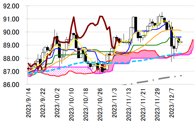 88.36円前後で推移する 90日移動平均線や薄い雲を再び試し