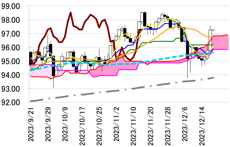 押し目買いスタンスで臨みたい。支持水準としては 96.17 円