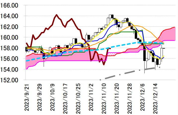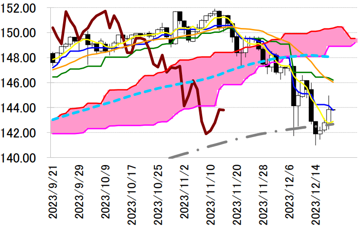 ドル円は、12 月 7 日の植田日銀総裁の参院財政金融委員会での答弁で、「年末から来年にかけて一段と チャレンジングな状況になる」との発言を受けて、7 日の高値 147.32 円から 14 日の安値 140.97 円まで 下落。そして、昨日の植田日銀総裁の発言「国会で仕事への取り組み姿勢を問われ、一段と気を引き締め てというつもりだった」を受けて、144.96 円まで戻している。
