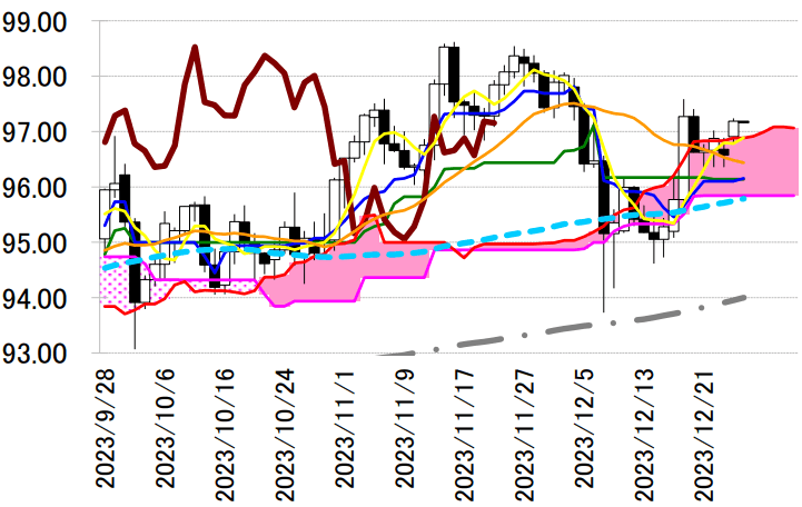 97.59 円が目先の上値の節目。同水準を抜けて上昇に勢いが
