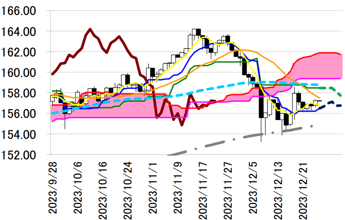 小陽線引け。一目均衡表・転換線付近の底堅さを維持した。本日 156.49 円へ切り上がった同線を支えに 158 円割れ水準