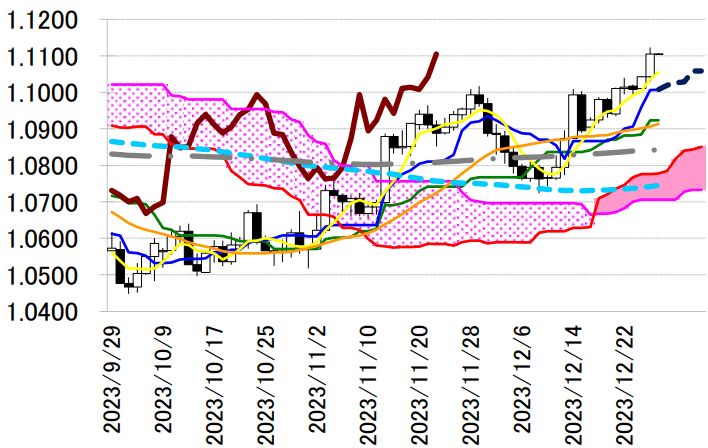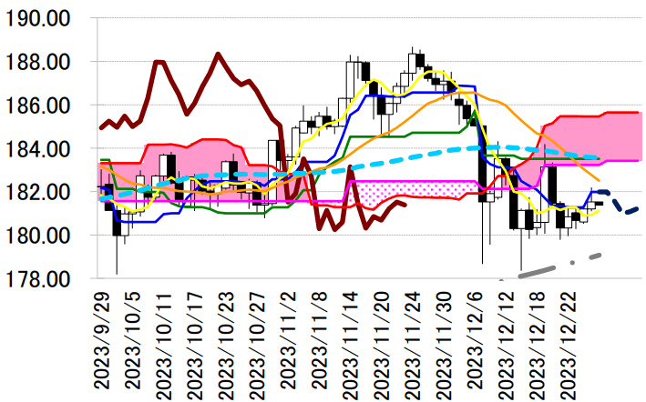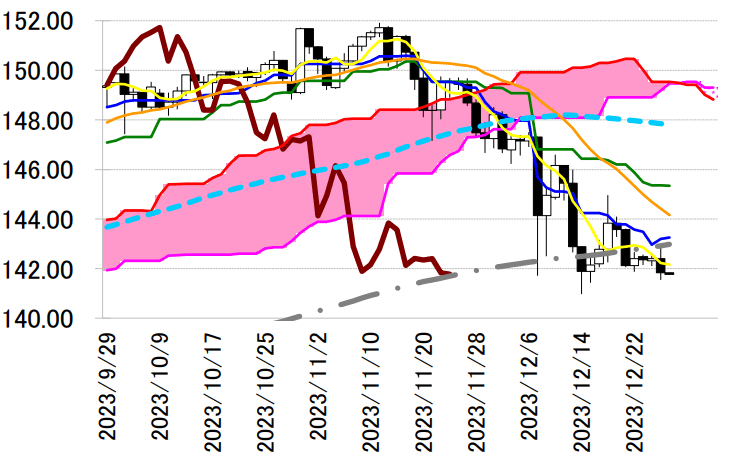 昨日は 1 日を通すと結果的にはドル安・円高になったが、今週に入り円安に傾く材料も豊富に出ている。 26 日に発表された 11 月の全国消費者物価指数(CPI)から算出した「刈込平均値」「加重中央値」「最頻 値」のインフレ基調 3 指標が、生鮮食料品を除くコア CPI が 2%を超えてからは 22 年 4 月以来となる 3 指標の伸び率が同時にすべて縮小した。そして、昨日発表された 12 月 18-19 日に行われた日銀金融政策 決定会合における主な意見で、「(現在、慌てて利上げしないと、ビハインド・ザ・カーブになってしまう 状況にはなく)少なくとも来春の賃金交渉の動向を見てから判断しても遅くはない」との見解が示された。 これまで市場が日銀のゼロ金利政策解除への期待が先走り過ぎていた巻き返しが入りやすい状況下にあ り、ドル円の下値を支えることになるだろう。本日は、本邦の 11 月鉱工業生産・速報値が発表されるが、 前年比で 10 月の+1.1%から-2.1%、前月比では+1.3%から-1.6%への低下が予想されている。予想より マイナス幅が拡大した場合は、円安に動くか。