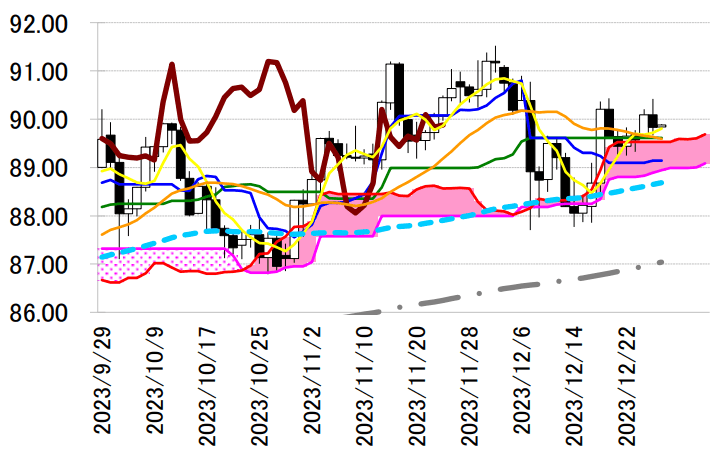 を割り込んでも雲の下限 88.94 円や 90 日移動平均線 88.69円は支えになるだろう。