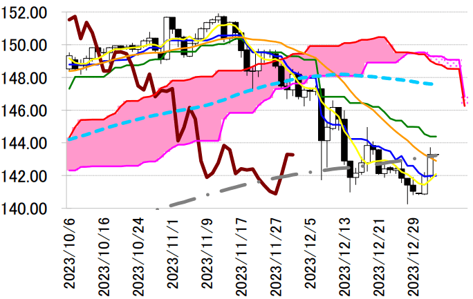 ドル円は、日本勢が不在の 2 日のシドニー市場で、能登半島地震を受けた思惑的な円の買い仕掛けで 140.82 円まで下落後、日銀の早期マイナス金利の解除が困難になったのではないかとの思惑から円売り が優勢となり、昨日は 200 日移動平均線が位置する 143 円台まで戻している。