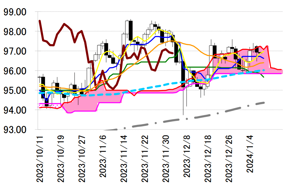 陰線引け。転換線は基準線を上回り、遅行スパンは実線を下回り、雲の中で引けた。3 手連続陽線の後に抱き線で反落したものの転換線を上回って引けており、反発の可能性が示唆されている。本日は転換線 96.72 円を念頭に置き、基準線を支持に押し目買いスタンスで臨み、同線を下抜けた場合は手仕舞い。