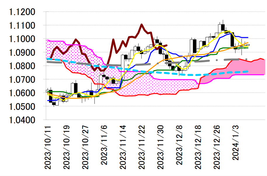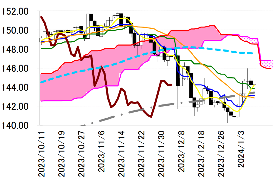 年初来のドル円は、2 日の安値 140.82 円から 3 手連続陽線で上昇。その後、5 日の米 12 月雇用統計を受けて高値 145.97 円まで続伸したものの寄引同事線となり、昨日は抱き線で反落した。テクニカル分析では、143 円台の日足一目均衡表・転換線(143.11 円)と基準線(143.88 円)、200 日移動平均線(143.42円)の上で推移していることで、買いバイアスが優勢な展開となっている。