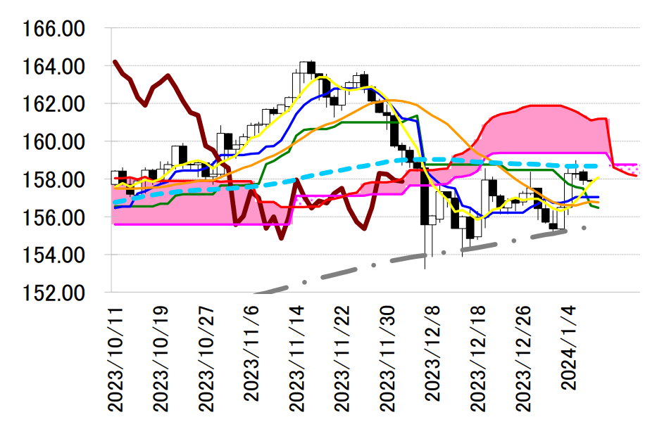 陰線引け。転換線は基準線を上回っているものの、遅行スパンは実線を下回り、雲の下で引けていることで、売りシグナルが優勢な展開。しかし、2 手連続陰線でも転換線を上回って引けており、反発の可能性が示唆されている。本日は、157 円手前で横ばいの転換線を支持に押し目買いスタンスで臨み、同線を下抜けた場合は手仕舞い。
