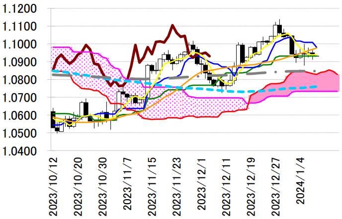 ユーロドルは反落。終値は 1.0931 ドルと前営業日 NY 終値(1.0950 ドル)と比べて 0.0019 ドル程度の ユーロ安水準だった。欧州時間発表の 11 月独鉱工業生産が予想を下回ったことを受けて、NY 市場でもユ ーロ売り・ドル買いが進行。ロンドン・フィキシングに絡んだドル買いのフローが観測されると、前日の 安値 1.0923 ドルを下抜けて一時 1.0911 ドルと日通し安値を付けた。その後の戻りも 1.0940 ドル付近に とどまった。センテノ・ポルトガル中銀総裁は「欧州中央銀行(ECB)は最近の想定よりも早期に利下げ を実施し、5 月まで決断を待つ必要はない」と述べたほか、ビルロワドガロー仏中銀総裁は「インフレが ECB の目標である 2%にしっかりと持続的に定着すれば、年内に利下げが実施される」などと話した。