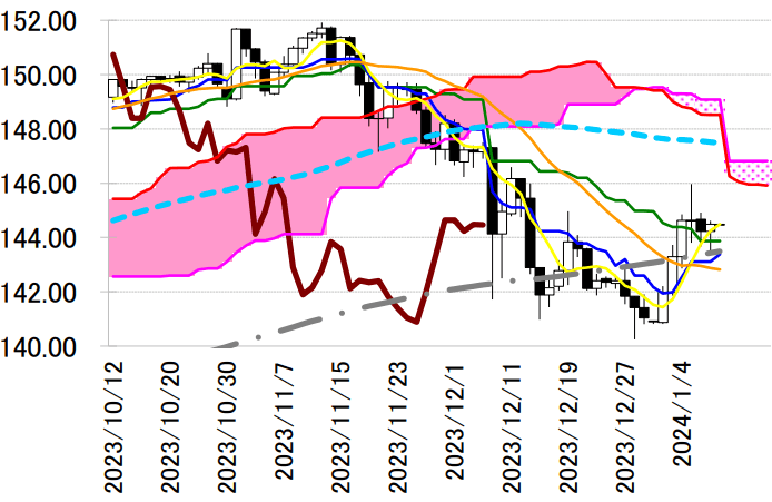 昨日のドル円は、本邦輸出企業からのドル売りで 200 日移動平均線の 143.42 円まで売られたものの、 攻防の分岐点である 200 日線や日足一目均衡表・転換線(143.11 円)が支持帯となり、米 10 年債利回り も 4.0%台を維持したことで 144.62 円まで反発した。