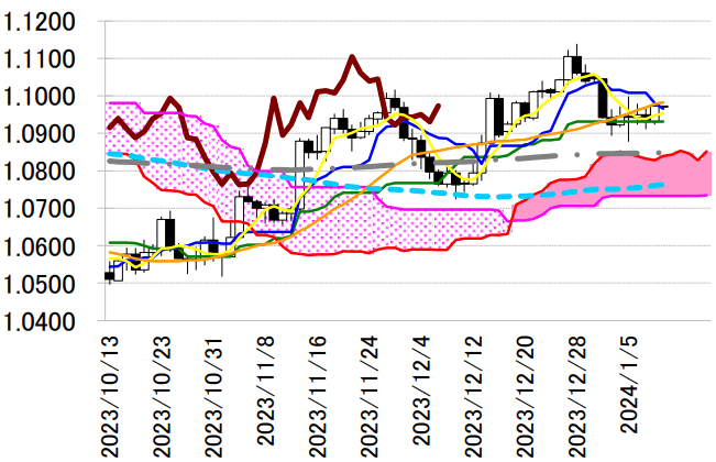 ドル円のテクニカル分析では、昨年 11 月 13 日の高値 151.91 円から 12 月 28 日の安値 140.25 円まで 11.66 円下落した後、今年 1 月 5 日の高値 145.97 円まで反発して、半値戻しの 146.08 円に迫っている。 明日の日足一目均衡表・雲の下限が 146.04 円に位置していることで、146 円台に乗せて抵抗帯である雲 の中に入っていくのか否かが注目ポイントになる。