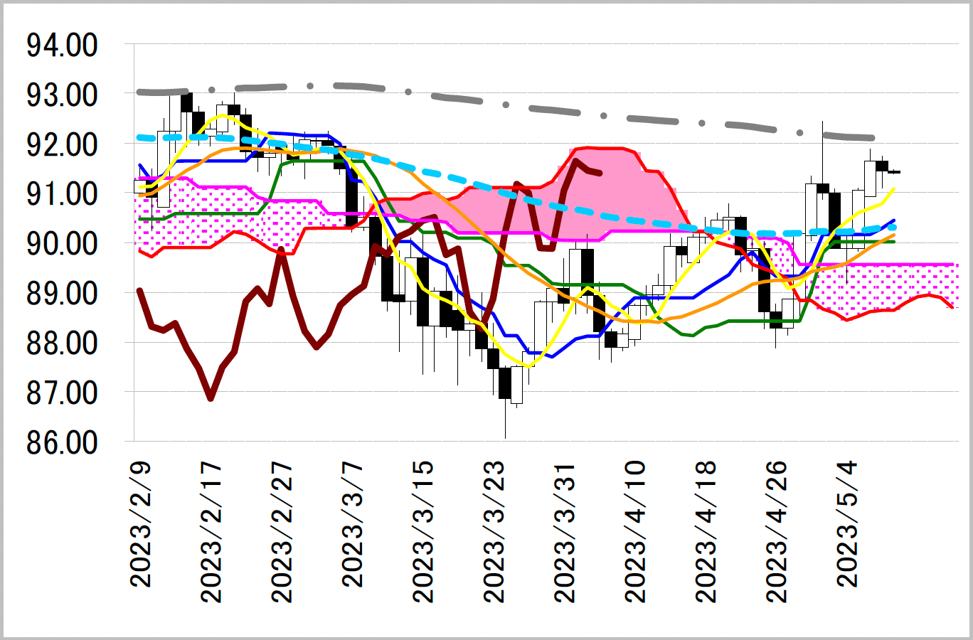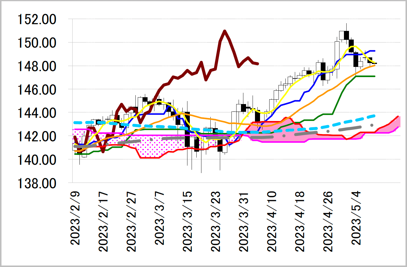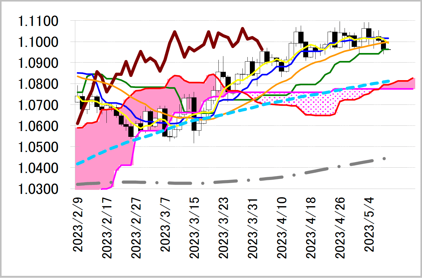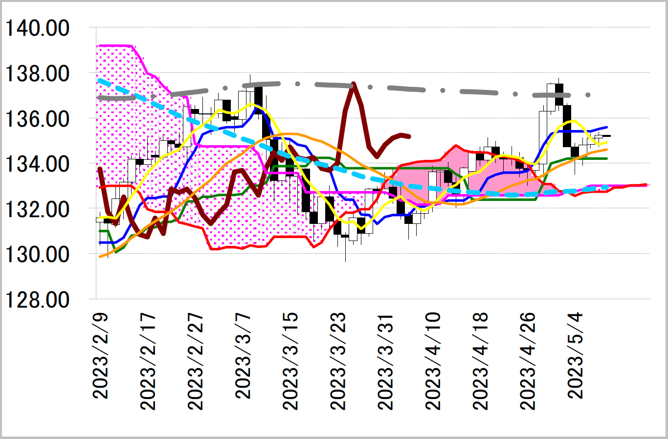 ドル円の今週の高値は、8日が135.30円、9日が135.36円までとなっており、日足一目均衡表・転換線(※本日は135.58円)が上値を抑える構図が続いている。ドル円の上昇トレンドの再開は、債務上限が引き上げられる可能性が高まり、米国4月CPIがインフレ伸び率鈍化を打ち消すような結果を待つことになる。