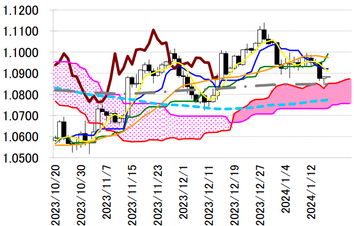 1.0847 ドルや一目・雲の上限 1.0852 ドルが意識される。