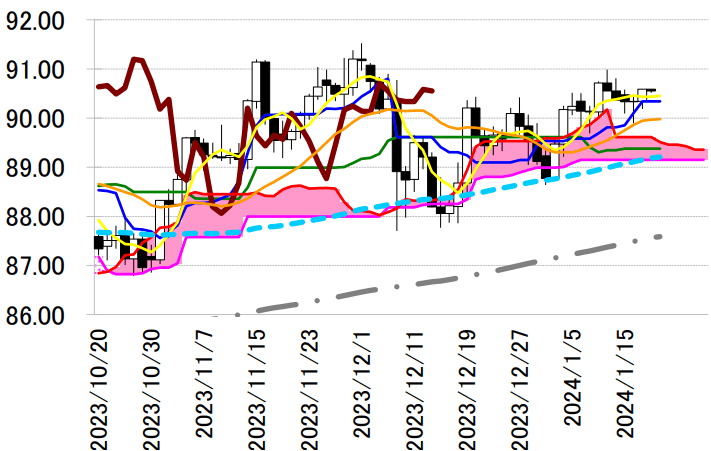 本日は 90.34 円の転換線を念頭に置き、基準線を支持に押