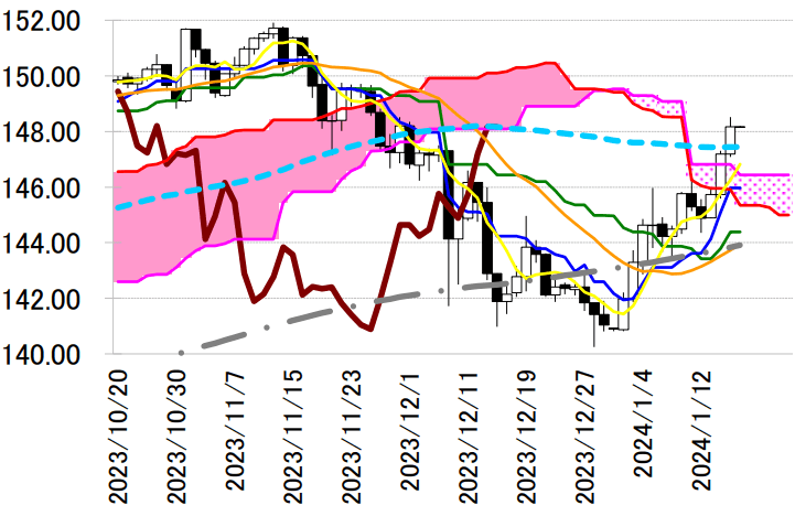 ドル円が、1 月 2 日の安値 140.82 円から昨日の高値 148.52 円まで買い戻されている背景には、3 月 FOMC での利下げ開始観測の後退、そして、日銀の早期のマイナス金利解除観測の後退が挙げられる。