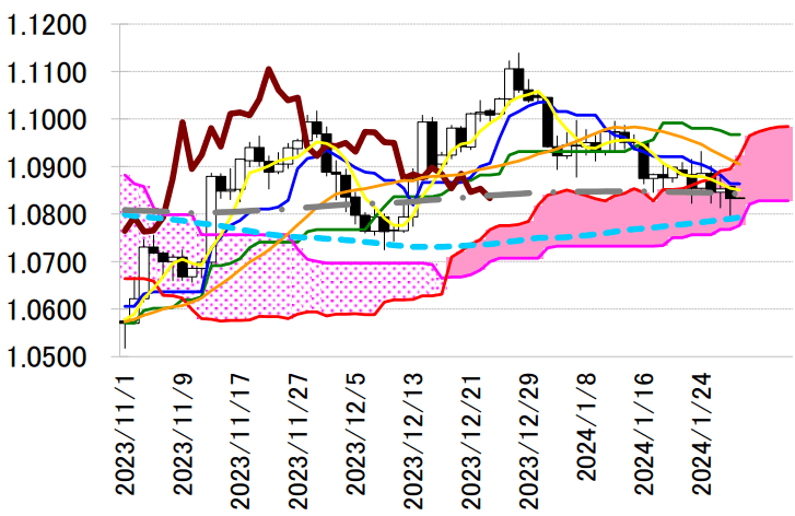 ただ、NY 午後に入ると急速に下げ渋った。米財務省が第 1 四半期の借り入れ予想額を下方修正すると 米長期金利が大幅に低下し、全般ドル売りが進行。5 時 30 分前には 1.0841 ドル付近まで下げ幅を縮めた。