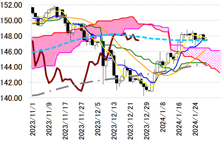 ドル円の一目均衡表でのテクニカル分析は、三役好転の強い買いシグナルが点灯しているものの、攻防 の分岐点である転換線 147.73 円を下回って推移していることで、売りシグナルが点灯する可能性が高ま っている。